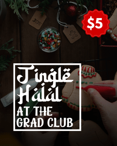 Join the SOGS International and Racial Equity Commissions, and the Graduate Peer Support Committee for JINGLE HALAL event at the Grad Club!