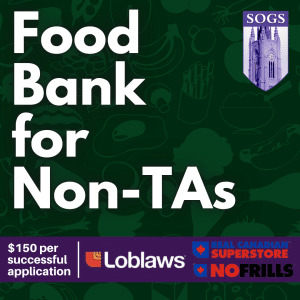 SOGS recognizes that food insecurity is an increasing challenge faced by graduate students at Western. As part of SOGS’ commitment to health and wellness initiatives on campus, the SOGS food bank program for non-TA members aims to reduce the impact financial shortfalls have on a student’s ability to access healthful and nutritious food options for themselves and their families.
