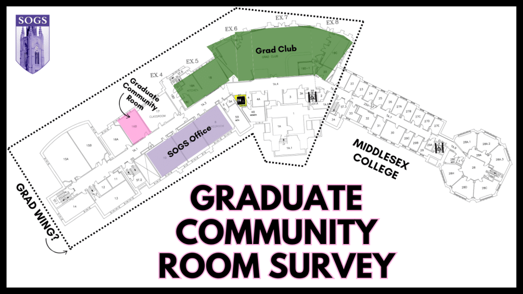 ABOUT THE GRADUATE COMMUNITY ROOM: Middlesex College 16B is 400 square foot space across the hall from the SOGS office that can accommodate up to 30 people. This space was offered to our Society to occupy as early as February 1, 2025, with an occupancy rate of $833.33 per month.
