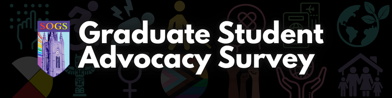 The SOGS Advocacy portfolio is looking for graduate student members to complete our bi-annual ADVOCACY SURVEY. This survey asks members a series of demographic questions so we can better understand the nuances of our members and their experiences. The survey also asks students to provide feedback on matters such as financial investing at Western and SOGS before the survey breaks up into different constituency questions (e.g., accessibility, gender equity, gender equity, indigenous, international, pride, and racial equity and inclusivity).