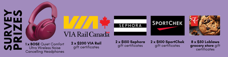Prizes: Due to the in-depth nature and length of the survey, we have increased our prizes! All prizes will be selected via a randomized draw.